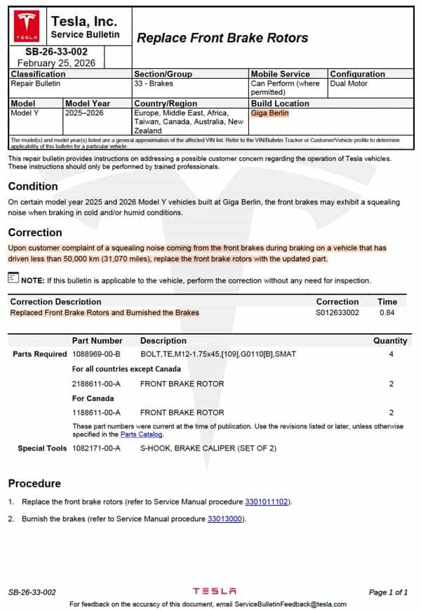 Well, stop the gaslighting. Tesla just officially admitted it’s a known issue. On February 25, 2026, they released an official Service Bulletin (SB-26-33-002) that authorizes a free fix for the infamous Model Y Juniper brake noise.